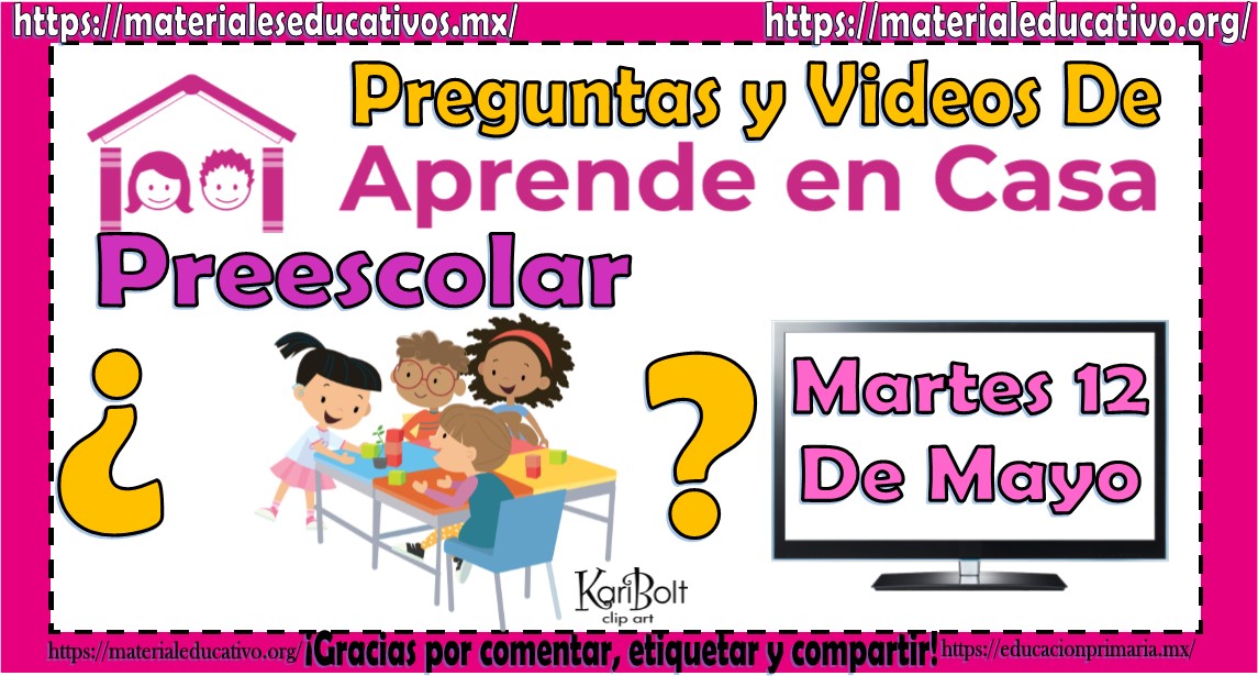 Padres de familia, alumnos y maestros, para apoyar a los alumnos en la realización de las actividades de sus clases por TV y en línea queremos compartirles las preguntas y videos de preescolar del programa aprende en casa por TV del martes 12 de mayo con esto sus hijos y nuestros pequeños alumnos podrán realizar más fácilmente las actividades que se les piden y podrán prestar la atención que se requiere a las clases sin tener que preocuparse por anotar las preguntas o las actividades que se les solicita, recopilamos este material en PDF y editable en WORD para que puedan descargar más fácilmente los archivos pero también se los queremos dejar en la página WEB, al final podrán descargar el archivo en para imprimir.