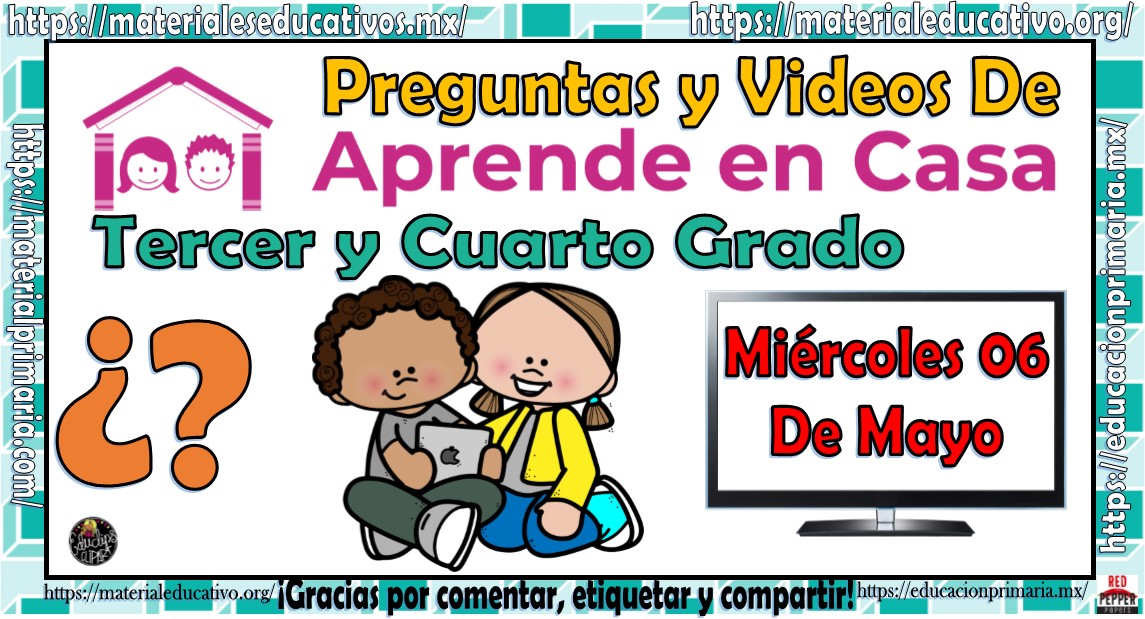 Padres de familia, alumnos y maestros, para apoyar a los alumnos en la realización de las actividades de sus clases por TV y en línea queremos compartirles las preguntas y videos para tercer y cuarto grado de primaria del programa aprende en casa por TV del día miércoles 06 de mayo con esto sus hijos podrán realizar más fácilmente las actividades que se les piden y podrán prestar la atención que se requiere a las clases sin tener que preocuparse por anotar las preguntas o las actividades que se les solicita, recopilamos este material en PDF y editable en WORD para que puedan descargar más fácilmente los archivos pero también se los queremos dejar en la página WEB, al final podrán descargar el archivo en para imprimir.