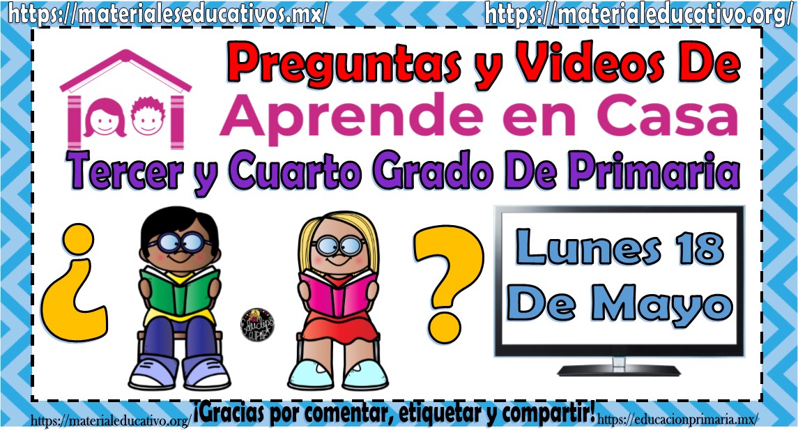Padres de familia, alumnos y maestros, para apoyar a los alumnos en la realización de las actividades de sus clases por TV y en línea queremos compartirles las preguntas y videos para tercer y cuarto grado de primaria del programa aprende en casa por TV del día lunes 18 de mayo con esto sus hijos podrán realizar más fácilmente las actividades que se les piden y podrán prestar la atención que se requiere a las clases sin tener que preocuparse por anotar las preguntas o las actividades que se les solicita, recopilamos este material en PDF y editable en WORD para que puedan descargar más fácilmente los archivos pero también se los queremos dejar en la página WEB, al final podrán descargar el archivo en para imprimir.