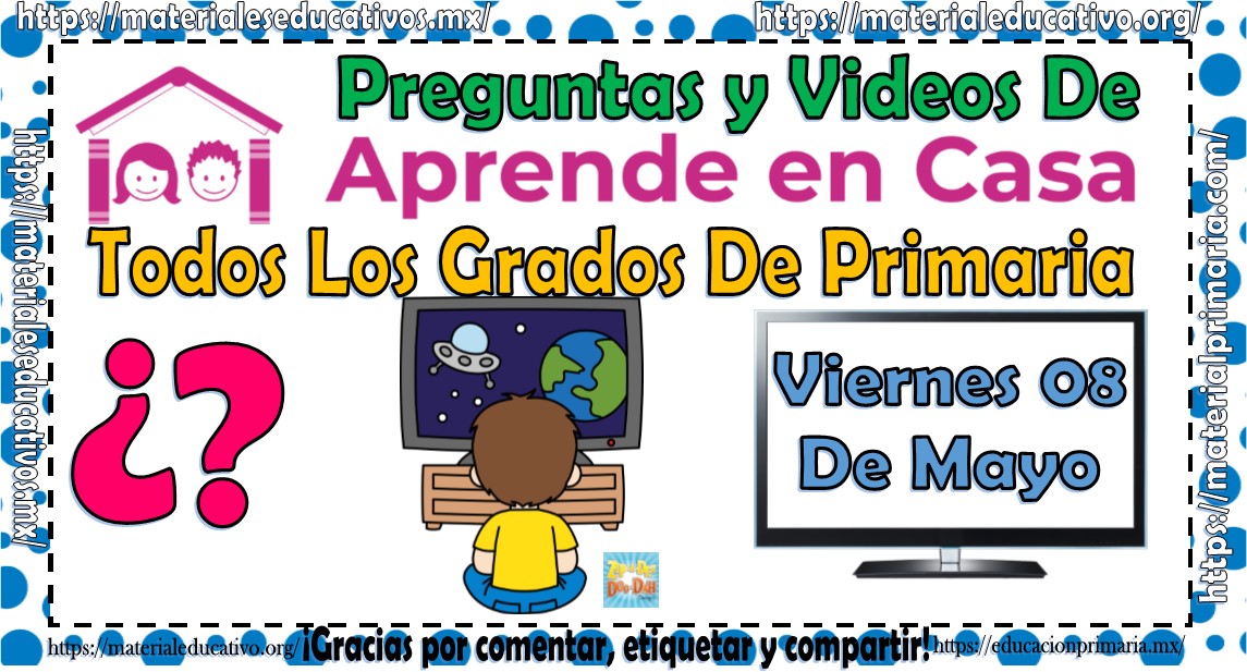 Padres de familia, alumnos y maestros, para apoyar a los alumnos en la realización de las actividades de sus clases por TV y en línea queremos compartirles las preguntas y videos para todos los grados de primaria del programa aprende en casa por TV del viernes 08 de mayo con esto sus hijos podrán realizar más fácilmente las actividades que se les piden y podrán prestar la atención que se requiere a las clases sin tener que preocuparse por anotar las preguntas o las actividades que se les solicita, recopilamos este material en PDF y editable en WORD para que puedan descargar más fácilmente los archivos pero también se los queremos dejar en la página WEB, al final podrán descargar el archivo en para imprimir.