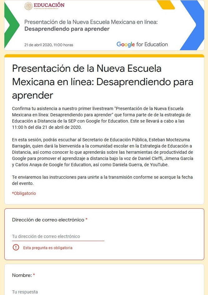 Confirma tu asistencia a nuestro primer livestream «Presentación de la Nueva Escuela Mexicana en línea: Desaprendiendo para aprender» que forma parte de de la estrategia de Educación a Distancia de la SEP con Google for Education. Este se llevará a cabo a las 11:00 h del día 21 de abril de 2020.
