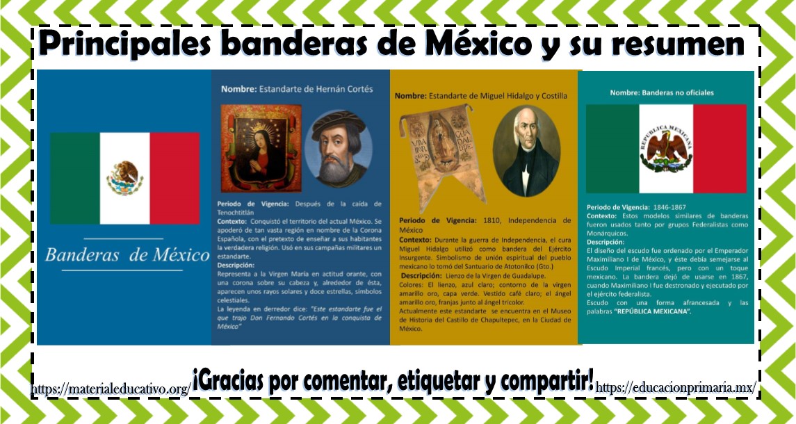 Compañeros y amigos docentes que nos visitan en esta ocasión queremos agradecer al Prof. Rudicel Ortiz – Equipo de Asesor Educativo por compartir con todos ustedes para este 24 de febrero las principales banderas de México y su resumen, de esta manera podemos conocer más sobre las banderas de nuestro país y de manera breve un resumen para conocer su historia y aspectos mas importantes que la caracterizan, esperando que les sea de gran utilidad les agradecemos por apoyarnos en todo momento, muchas gracias por su magnifico apoyo.