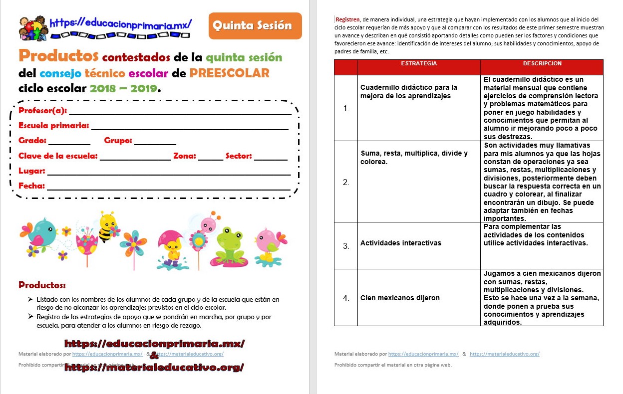 Compañeros y amigos docentes que nos visitan, seguimos trabajando y diseñando, en esta ocasión les proporcionamos los tan esperados ejemplos de Productos contestados de la quinta sesión del consejo técnico escolar ciclo 2018 – 2019 de preescolar, cabe aclarar que solo son ejemplos de los productos que realizaremos en esta quinta sesión del CTE, ustedes pueden tomar la información que consideren necesaria para poder elaborar sus propios productos y de esta manera agilizar el trabajo, estamos seguros que les será de gran utilidad, les pedimos que nos apoyen compartiendo nuestros enlaces en sus redes sociales y etiquetando a sus compañeros y amigos en sus redes sociales.