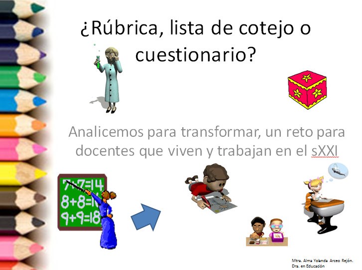 Compartimos esta excelente presentación sobre la ¿Rúbrica, lista de cotejo o cuestionario? Creado por la Mtra. Alma Yolanda Arceo Rejón. A quien agradecemos por su enorme dedicación a la educación, esperamos que les sea de gran utilidad en su labor docente, muchas gracias por su apoyo.
