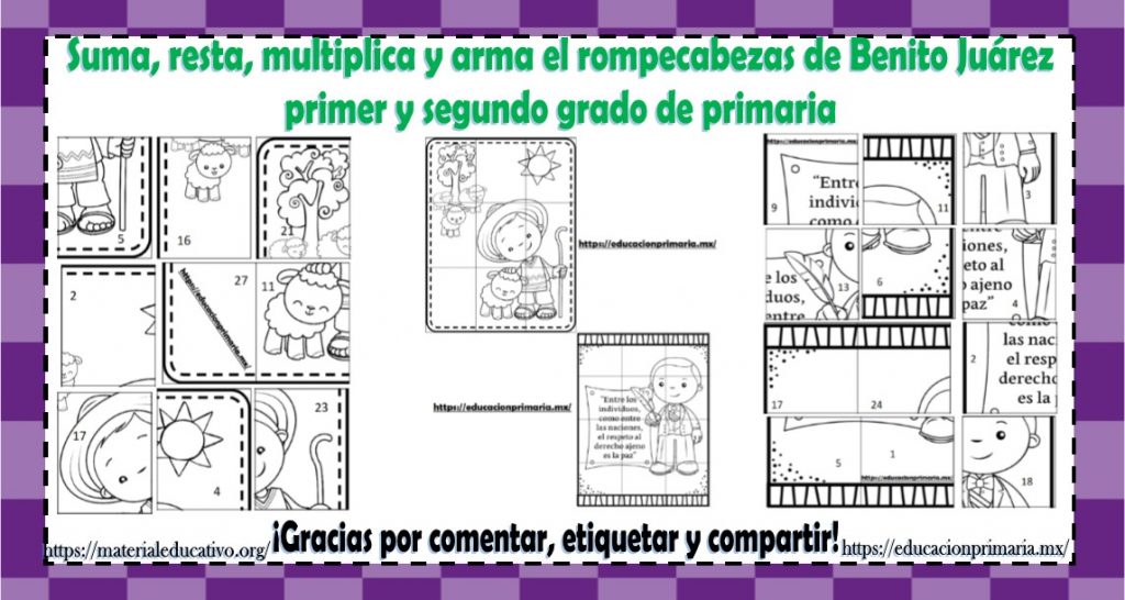 Se aproxima el natalicio de Benito Juárez y por tal motivo diseñamos este creativo y original material matemático para poder trabajar con nuestros alumnos, se trata de suma, resta, multiplica y arma el rompecabezas de Benito Juárez para primer y segundo grado de primaria, nuestros alumnos quedaran encantados con estas actividades pues al resolver los problemas matemáticos podrán armar y colorear el dibujo, estamos seguros que les encantara, recuerden etiquetar a sus compañeros y amigos docentes en nuestras publicaciones y compartirlas en sus redes sociales.