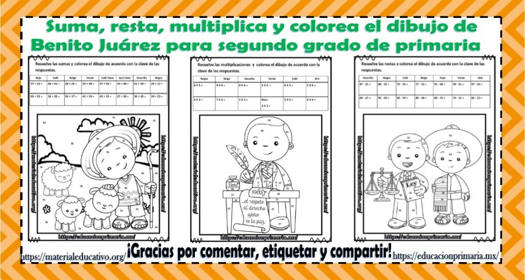 Se aproxima el natalicio de Benito Juárez y por tal motivo diseñamos este creativo y original material matemático para poder trabajar con nuestros alumnos, se trata de Suma, resta, multiplica y colorea el dibujo de Benito Juárez para segundo grado de primaria, nuestros alumnos quedaran encantados con estas actividades pues al resolver los problemas matemáticos podrán colorear el dibujo, estamos seguros que les encantara, recuerden etiquetar a sus compañeros y amigos docentes en nuestras publicaciones y compartirlas en sus redes sociales.