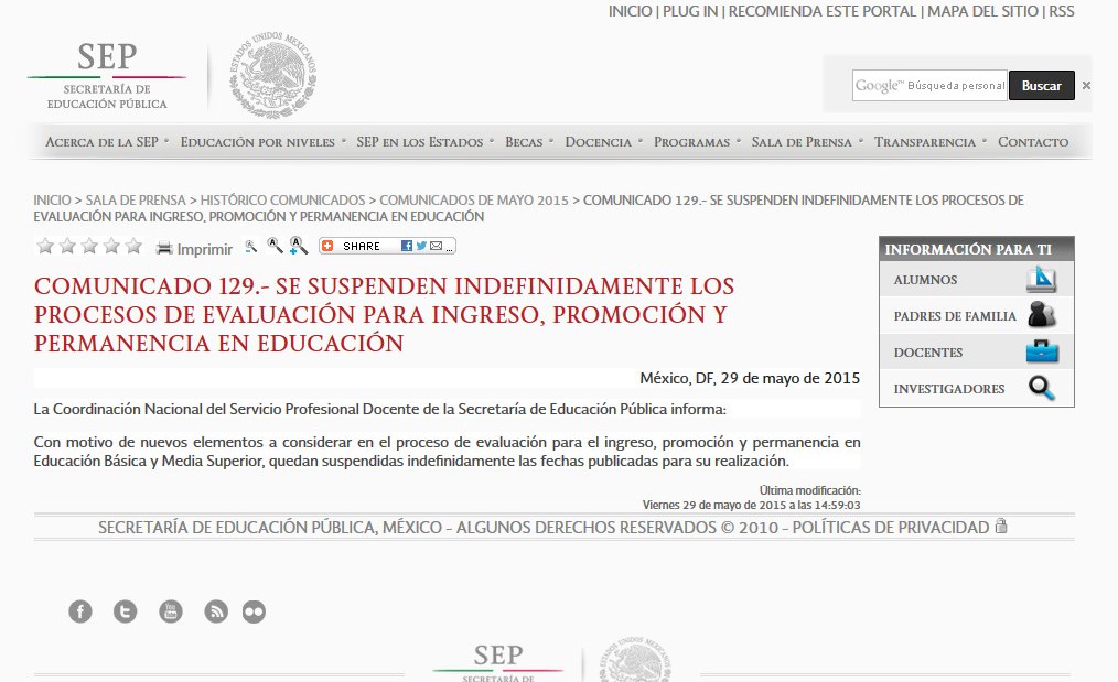La Secretaría de Educación Pública mediante el comunicado 129 informó en un escueto comunicado que se suspenden indefinidamente los procesos de evaluación para ingreso, promoción y permanencia.