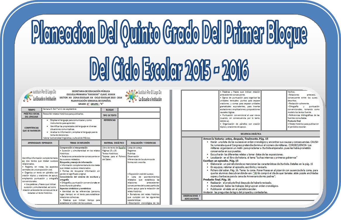 Compartimos las Planeaciones del quinto grado del primer bloque del ciclo escolar 2015 – 2016, estas planeaciones nos las enviaron…