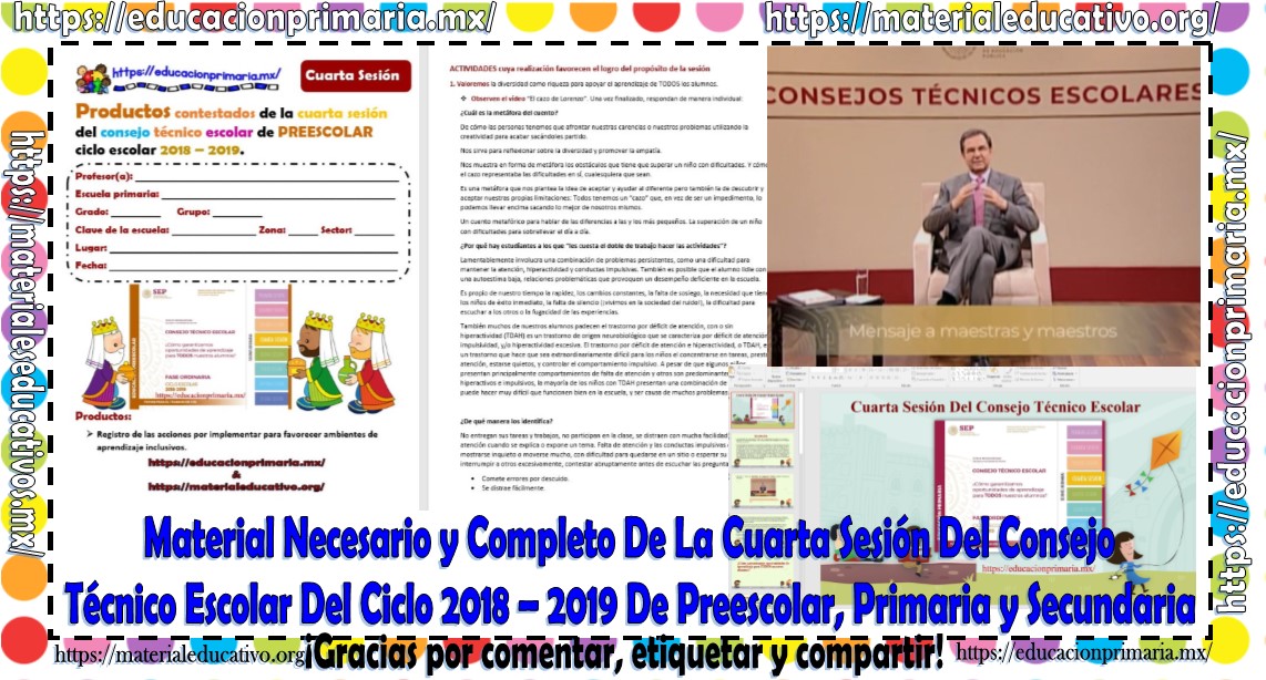 Amigos y compañeros docentes que nos visiten, después de mucho trabajo y esfuerzo les compartimos todo el material necesario y completo de la cuarta sesión del consejo técnico escolar del ciclo 2018 – 2019 de preescolar, primaria y secundaria con el cual seguramente podremos agilizar y facilitar el trabajo durante esta cuarta sesión del CTE, esperando que todo este material les sea de gran utilidad les queremos pedir su apoyo compartiendo nuestros enlaces en sus redes sociales y etiquetando a sus compañeros y amigos docentes en nuestras publicaciones, muchas gracias.